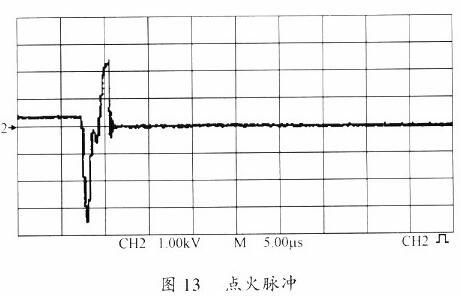 圖11顯示了輸出電流換向時驅動信號的變化。圖12為輸出電流換向時電感電流的變化,可以看到電流的過沖相當小。圖13為點火脈沖,由于點火是在低頻情況下進行,所以點火成功率很高。圖14為燈正常工作時的電流和電壓波形,可以看出燈電流基本沒有電流過沖的情況發生。整機效率約為90%,波峰系數為1.1。(插圖)