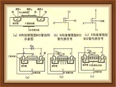 在一塊摻雜濃度較低的P型硅襯底上,制造兩個高摻雜濃度的N+區(qū),并用金屬鋁引出兩個電極,別離作漏極d和源極s。然后在半導體外表掩蓋一層很薄的二氧化硅(SiO2)絕緣層,在漏——源極間的絕緣層上再裝上一個鋁電極,作為柵極g。在襯底上也引出一個電極B,這就構成了一個N溝道增強型MOS管。MOS管的源極和襯底通常是接在一同的(大多數(shù)管子在出廠前已聯(lián)接好)。它的柵極與其它電極間是絕緣的。圖(a)、(b)別離是它的構造示意圖和代表符號。代表符號中的箭頭方向標明由P(襯底)指向N(溝道)。P溝道增強型MOS管的箭頭方向與上述相反,如圖(c)所示。
