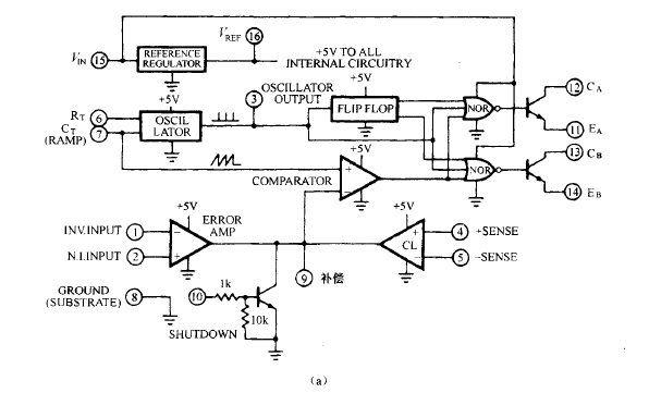 在圖 9.7 C b ) 中,變壓器初級(jí)連接到 PWM 芯片的 11 腳和 14 腳。在半周期的導(dǎo)通時(shí)間 內(nèi),11 腳相對(duì)于 14 腳為正 ,并輸出 200mA 電流。11 腳電位對(duì)地約為 +(Vh 2)V, 14 腳電位 對(duì)地約為+2V 。在半周期的死區(qū)時(shí)間內(nèi) ,11 腳和 14 腳都對(duì)地短路 。在下半周期 ,11 腳和 14 腳的極性顛倒 。若初級(jí)電壓為士 lOV ,則供電電壓 vh 應(yīng)約為 14V。