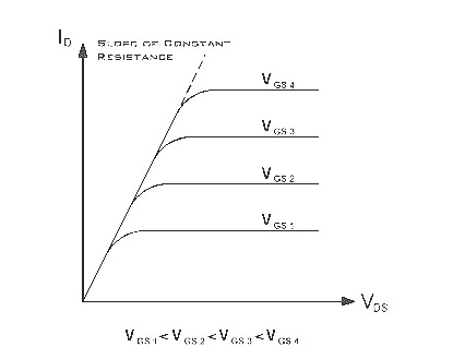 在這個區域內,UDS增加時,ID線性增加。在導電溝道接近夾斷時,增長變緩。在低UDS分開夾斷電壓較大時,MOS管相當于一個電阻,此電阻隨著UGS的增大而減小。截止區(UGS