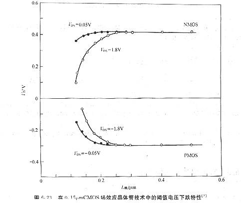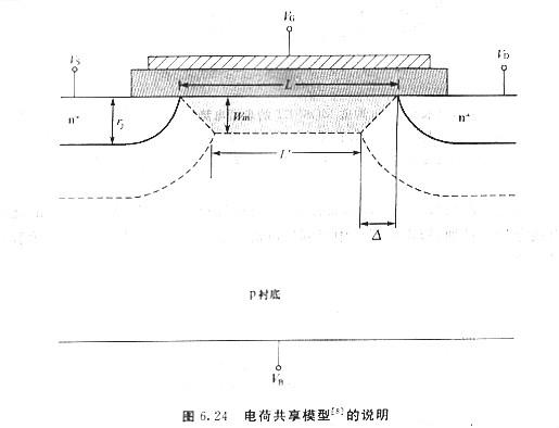 對長溝道器件而言,由于△(圖6.24)遠小于L,所以電荷減少量較小,但是關于短溝道器件而言,由于厶與L相仿,所以導通器件所需的電荷將大幅公開降,由式(47)可知,對給定一組已知的NA、Wm、ri以及Co,閾值電壓將隨溝道長度的縮減而下降.