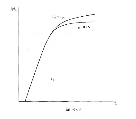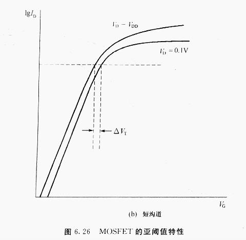圖6.26描繪在高與低的漏極偏壓條件下,長與短溝道的n溝道MOSFET的亞閾值特性.隨著漏極電壓的增加,短溝道器件中亞閾值電流的平行位移[圖6.26(b)]顯現有顯著DIBI.效應存在,