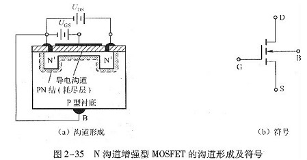 N溝道加強(qiáng)型MOSFET的溝道構(gòu)成及符號(hào)如圖2-35所示,其中圖2-35 (a)所示是在一塊雜質(zhì)濃度較低的P型半導(dǎo)體襯底上制造兩個(gè)高濃度的N型區(qū),并分別將它們作為源極s和漏極D,然后在襯底的外表制造一層Si02絕緣層,并在上面引出一個(gè)電極作為柵極G。圖2-35(b)所示是其在電路中的符號(hào)。