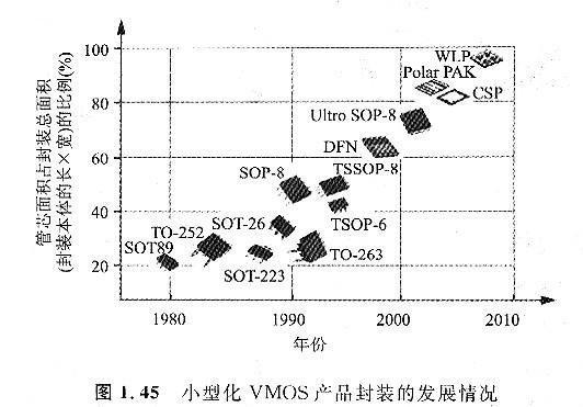 小型化封裝使管芯面積占封裝總而積(封裝本體的長與寬的乘積)的比例越來越大,近期開展起來的CsI,(Chip Size Package,芯片尺寸封裝)與WLP( WafcrLevel Package,晶圓級封裝),上述比例曾經到達了83%以上,這無疑有利于降低封裝的本錢,同時也有利于降低熱阻。小型化尺寸的封裝開展狀況如圖1. 45所示。