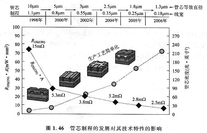 一個相對客觀的辦法是將管芯面積的要素思索進來,將管芯面積A與RDS(ON)相乘,得到一個名為“本征電阻”的參數以減少電流規格的影響(圖1.46)。本征電阻小,就意味著要么電流規格很高,要么適用的開關頻率很高。另一方面,管芯制程(芯片的設計與制造規程)的開展使管芯單元的密度逐步提高,也有利于管芯的小型化。在功率半導體方面,耗散功率會限制管芯制程的進一步減小,這方面還是滯后于小功率IC的。