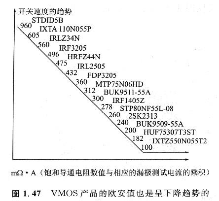 在普通狀況下,我們很難從公開的技術材料中查閱到管芯的詳細大小,一個粗略的替代辦法是,能夠用產品技術手冊中給出RDS(ON)和丈量這一數值所采,  用的漏極電流相乘,我們權且稱這個數值為“歐安值”。用歐安值也能得到相似的結果,如圖1. 47所示。
