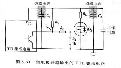 采用TTL集成電路驅(qū)動MOS另一個需求留意的問題是,工作電壓至少要高于VMOS的開啟電壓VGS(th),而且要保證圖中A點的驅(qū)動電壓高于開啟電壓。用CMOS來驅(qū)動根本上不需求思索這樣的問題,由于此類Ic能夠提供12V左右的信號電平(圖5.72)。