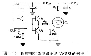 圖騰柱屬于推挽電路,因而能夠主動對VMOS的柵極停止放電,這樣一來,柵極泄放電阻能夠省略,也能夠取比擬大的數(shù)值,以防萬一。假如IC內(nèi)部的驅(qū)動才能缺乏,外部能夠增加擴(kuò)流電路,常見的電路方式也是圖騰柱的電路。關(guān)于集電極開路輸出的IC,如TTL集成電路,外接擴(kuò)流電路時,通常并不從集電極取信號,而是從發(fā)射極取信號(圖5. 75),這樣—來,內(nèi)部的集電極開路輸出級就變成了射極跟隨器,既降低了輸出阻抗,也有利于開關(guān)速度的進(jìn)步。