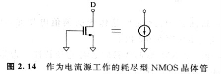 耗盡型晶體管對于模擬電路設(shè)計來說是一種很方便的器件。例如,使用耗盡型晶體管的1V以下的電源電壓下工作的rail to rail工作的OP放大器。另外,如圖2. 14所示,柵極和源極接地的耗盡型NMOS晶體管可以作為電流源使用。由于VGS=o,所以漏極電流可以表示為