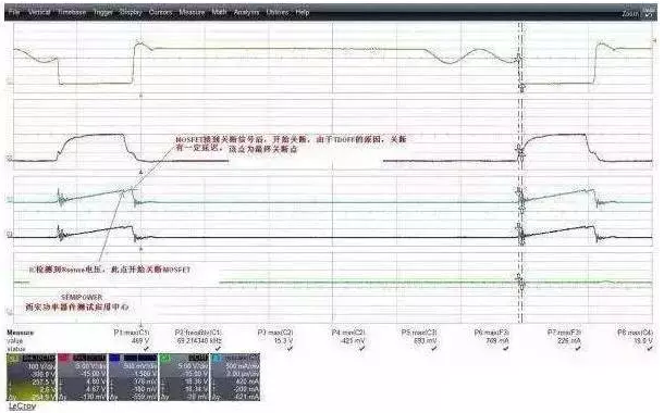 從圖中可以看出,電流波形在快到電流尖峰時(shí),有個(gè)下跌,這個(gè)下跌點(diǎn)后又有一段的上升時(shí)間,這段時(shí)間其本質(zhì)就是IC在檢測到過流信號執(zhí)行關(guān)斷后,MOSFET本身也開始執(zhí)行關(guān)斷,但是由于器件本身的關(guān)斷延遲,因此電流會有個(gè)二次上升平臺,如果二次上升平臺過大,那么在變壓器余量設(shè)計(jì)不足時(shí),就極有可能產(chǎn)生磁飽和的一個(gè)電流沖擊或者電流超器件規(guī)格的一個(gè)失效。