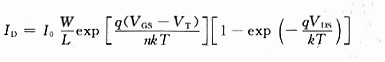 在弱反型區(qū),漏極電流關(guān)于VGS呈指數(shù)關(guān)系增加,電流表達(dá)式為下式: