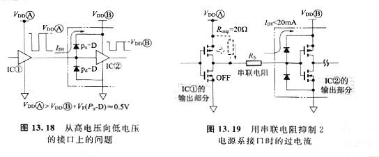 在接納IC的電源電壓比發(fā)送lC的電源電壓低的場(chǎng)所,如圖13.18所示,經(jīng)過(guò)IC②的輸入維護(hù)電路產(chǎn)牛的穩(wěn)定電流IIH會(huì)導(dǎo)致器件劣化,所以不能夠直接中止接口。針對(duì)這個(gè)問(wèn)題,如圖13. 19所示,采用給信號(hào)線(xiàn)插入串聯(lián)電阻,抑止電流IIH的方法。