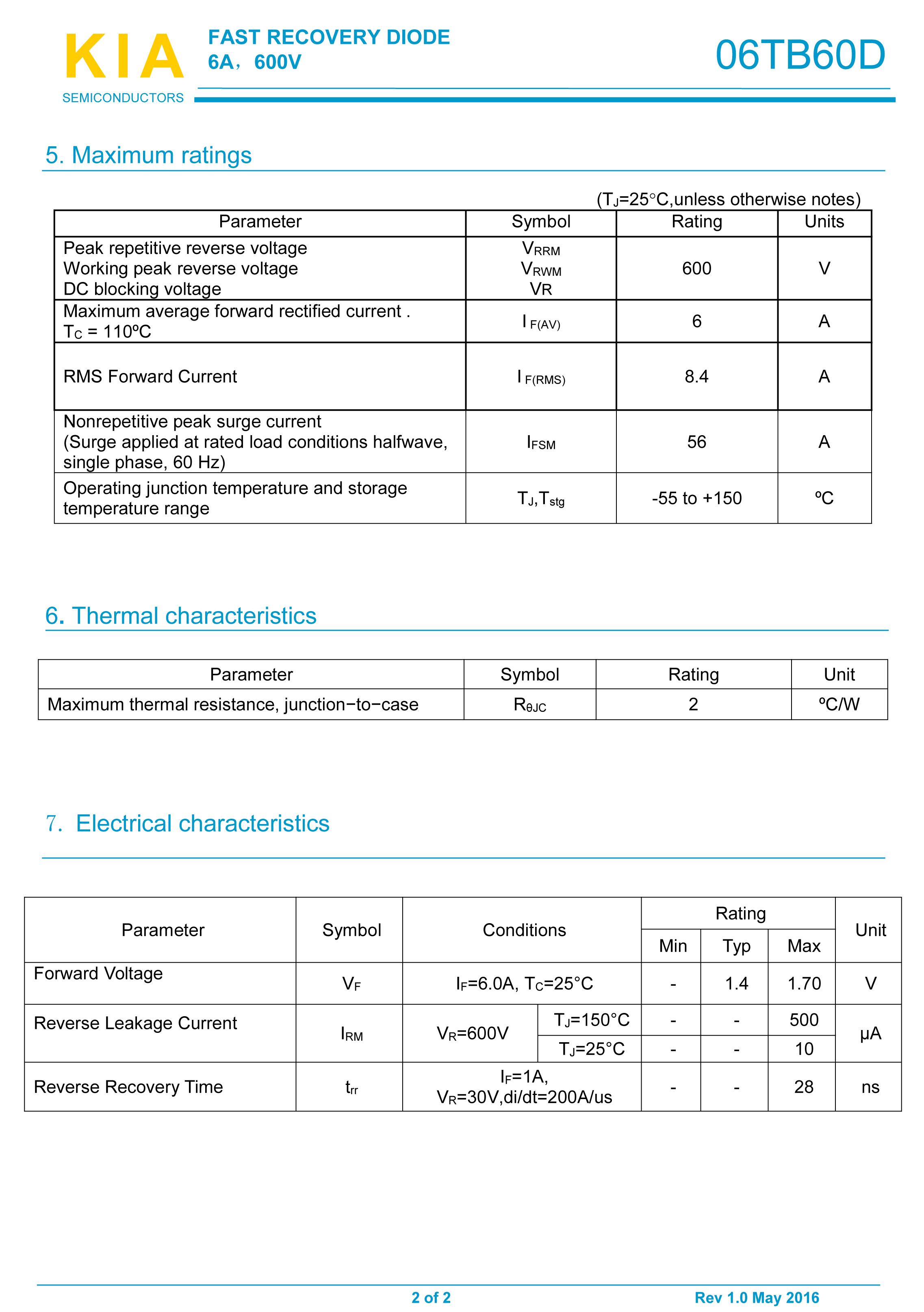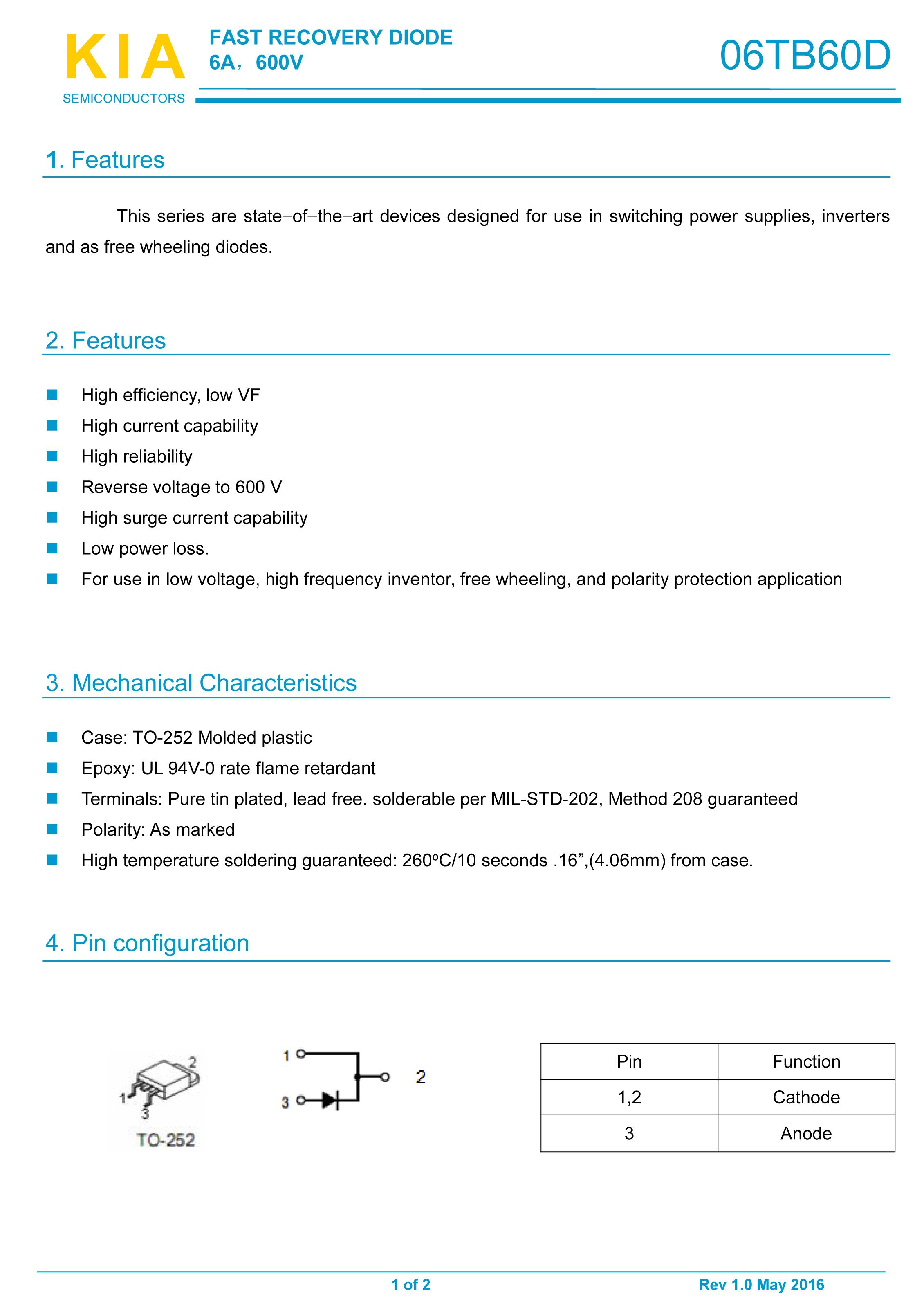 參數: VR(V): 600V IF(A): 6A Trr(ns): 25NS Package: TO-252