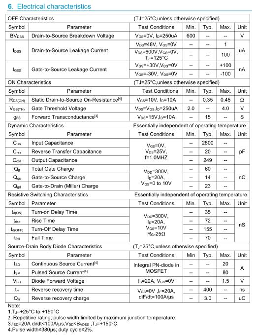 參數: ID(A): 20    BVDSS(V): 600    RDS(ON): 0.19    Package: TO-220F