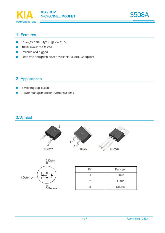 參數: ID(A): 70 BVDSS(V): 80 RDS(ON): 7.5mΩ Qg(nC): 55 Package: TO-252.TO-263.TO-220