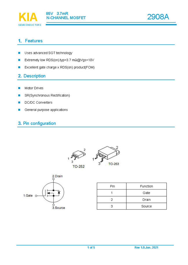 參數: ID(A): 130/110    BVDSS(V): 85    RDS(ON): 3.7mΩ    Qg(nC): 77    Package: TO-252.TO-263