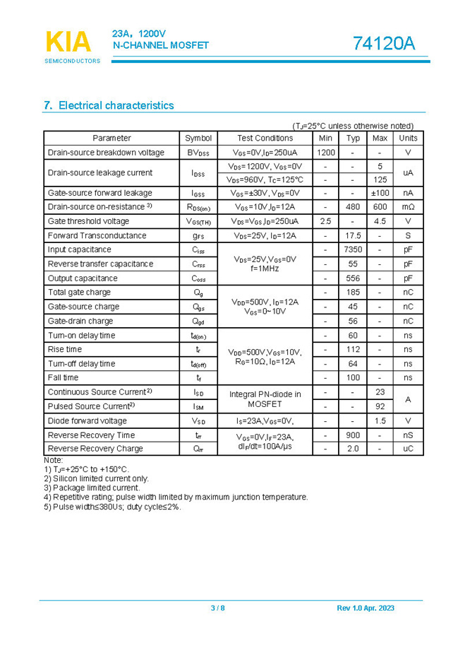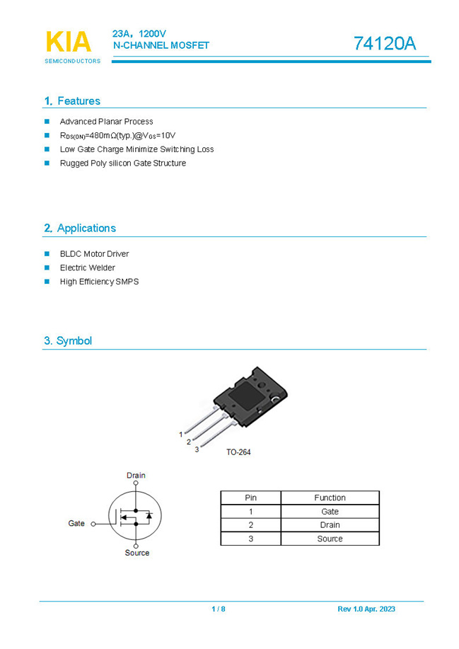 參數: ID(A): 23    BVDSS(V): 1200    RDS(ON): 480mΩ    Qg(nC): 185    Package: TO-264