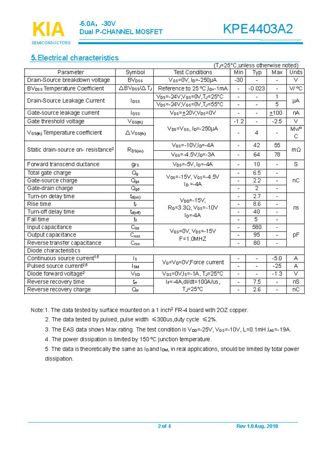 參數: ID(A): -5    BVDSS(V): -30    RDS(ON): 42mΩ    Qg(nC): 6.5    Package: SOP-8